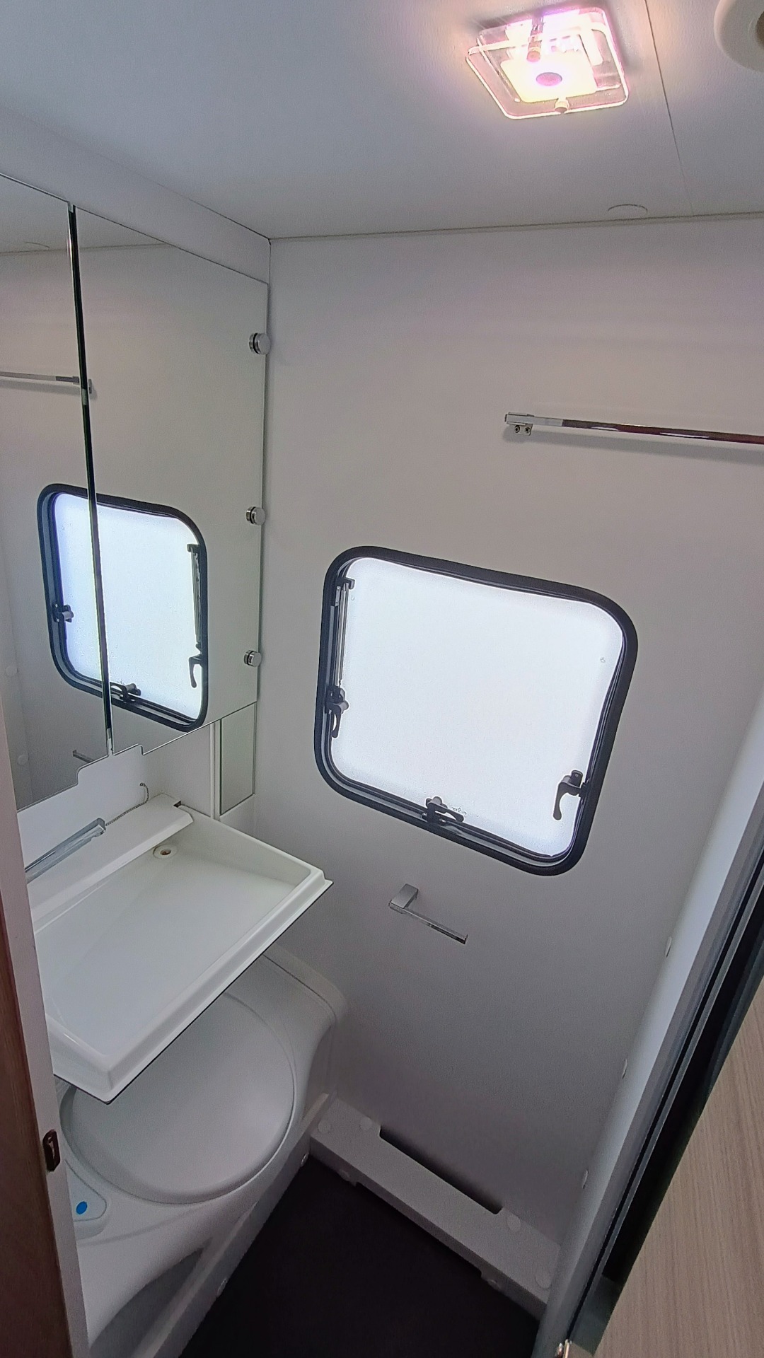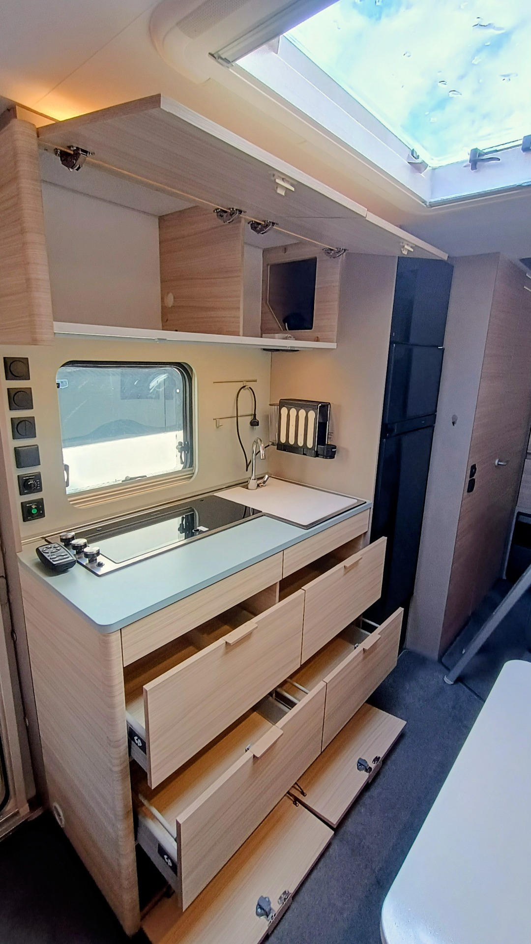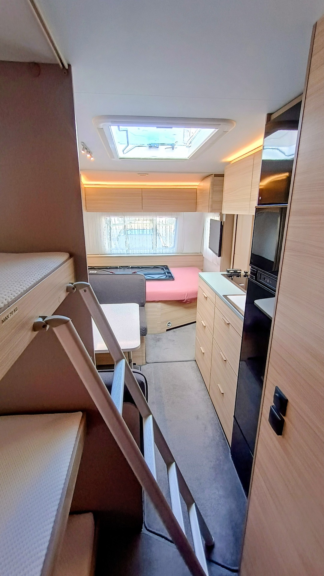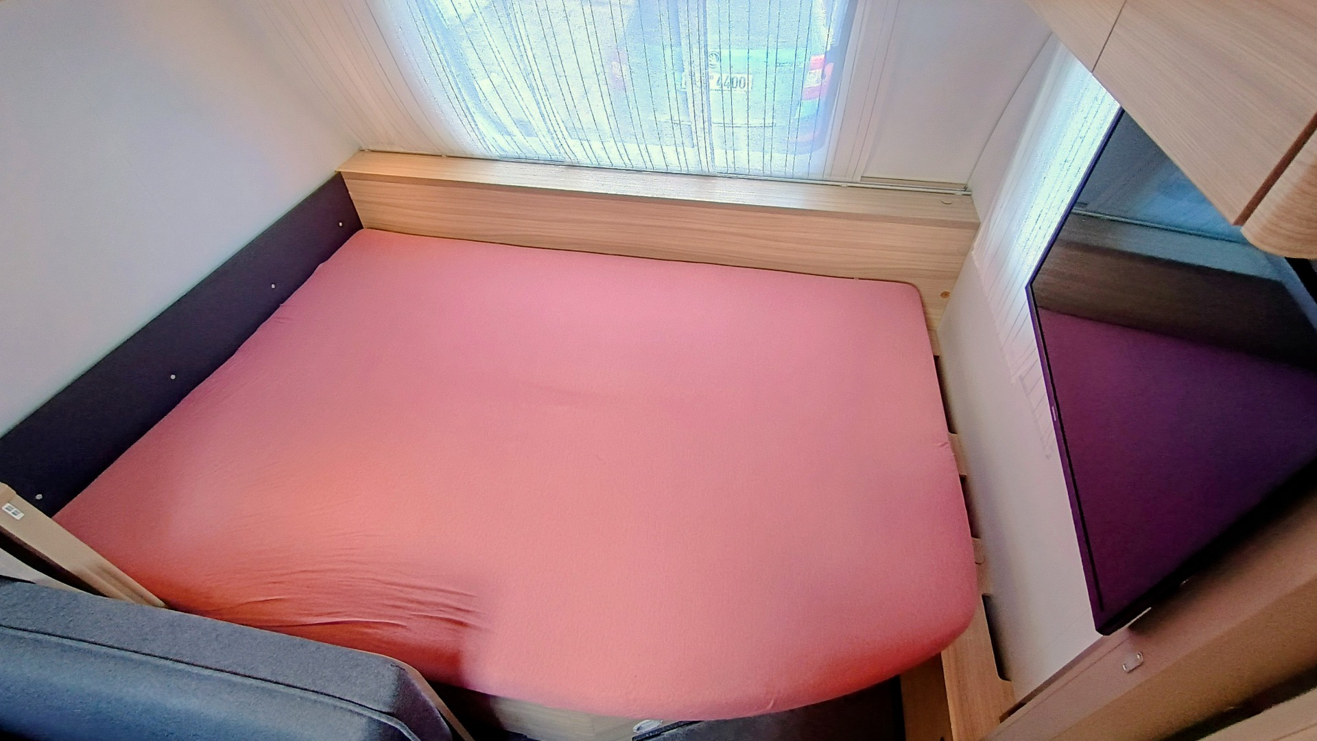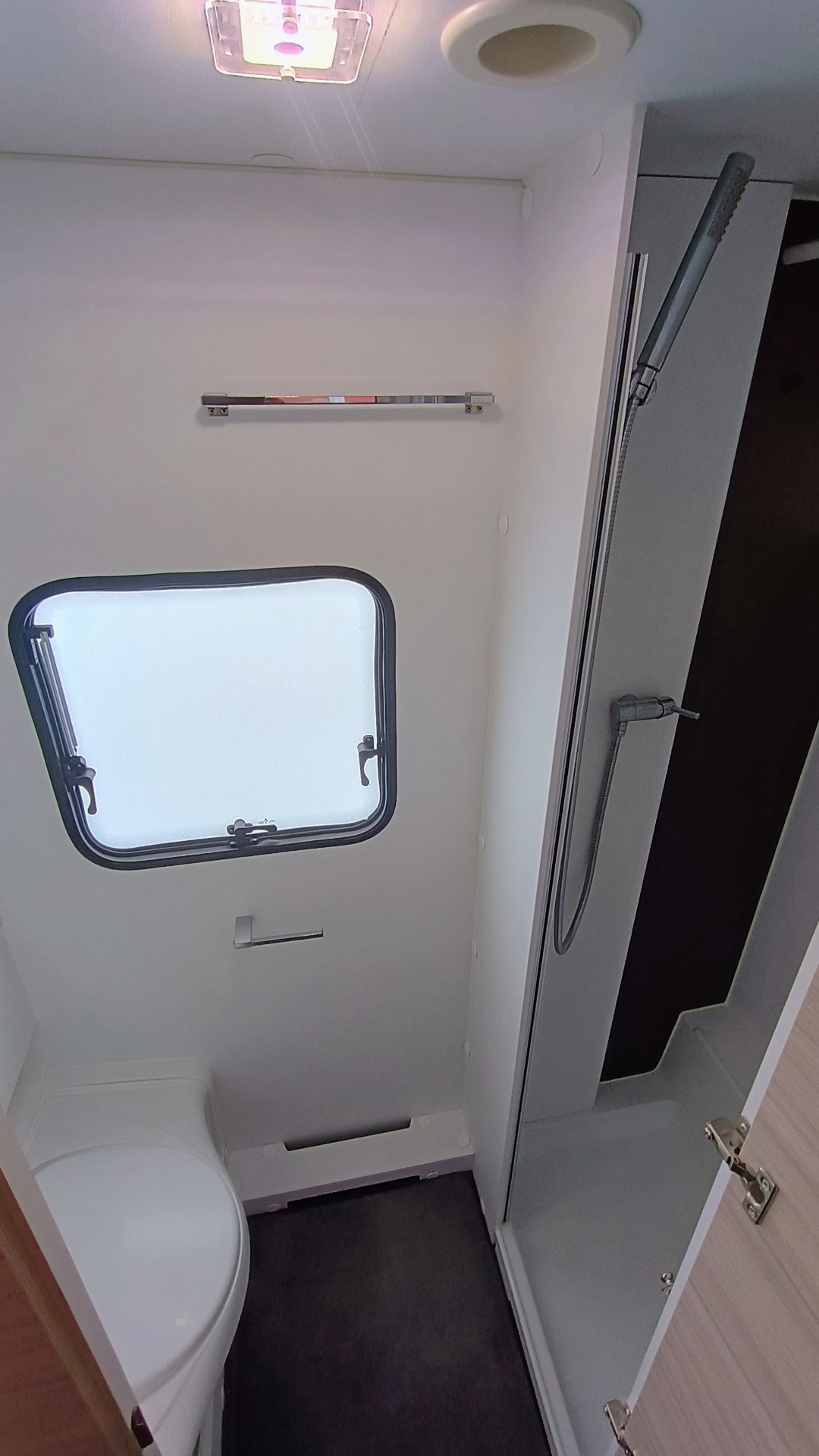* Vpředu velké lůžko, uprostřed sezení, které můžete proměnit v další lůžko. Naproti kuchyňka, vedle velká lednice + oddělený mrazák, vzadu koupelna s chemickým WC, umyvadlem a ODDĚLENÝM sprchovým koutem!!! Naproti 3x palanda