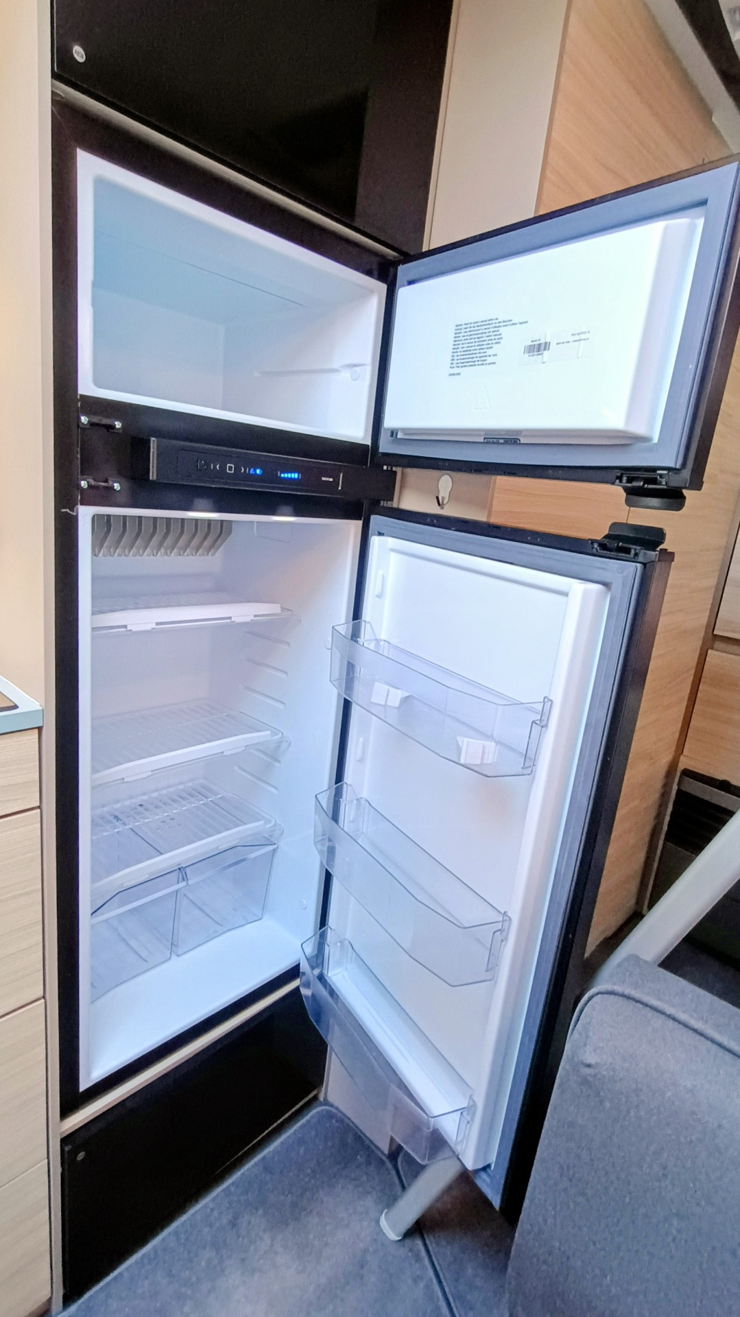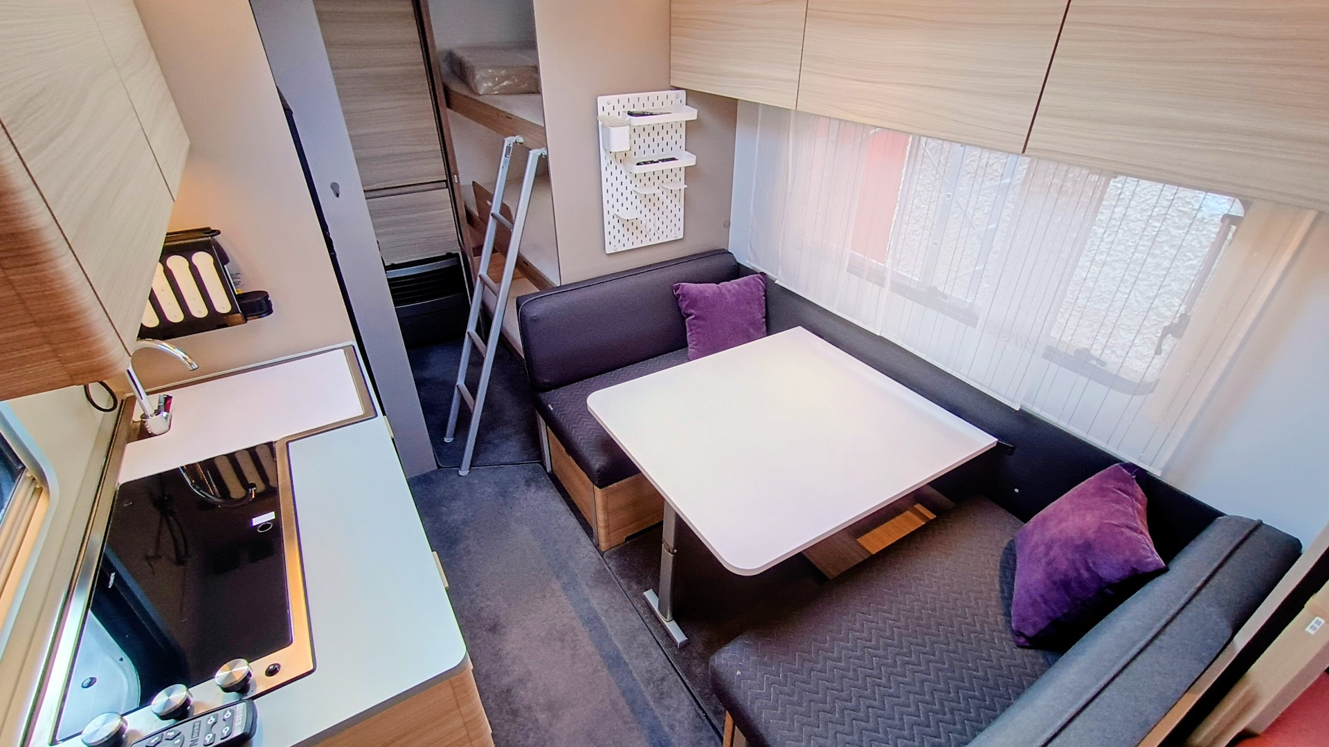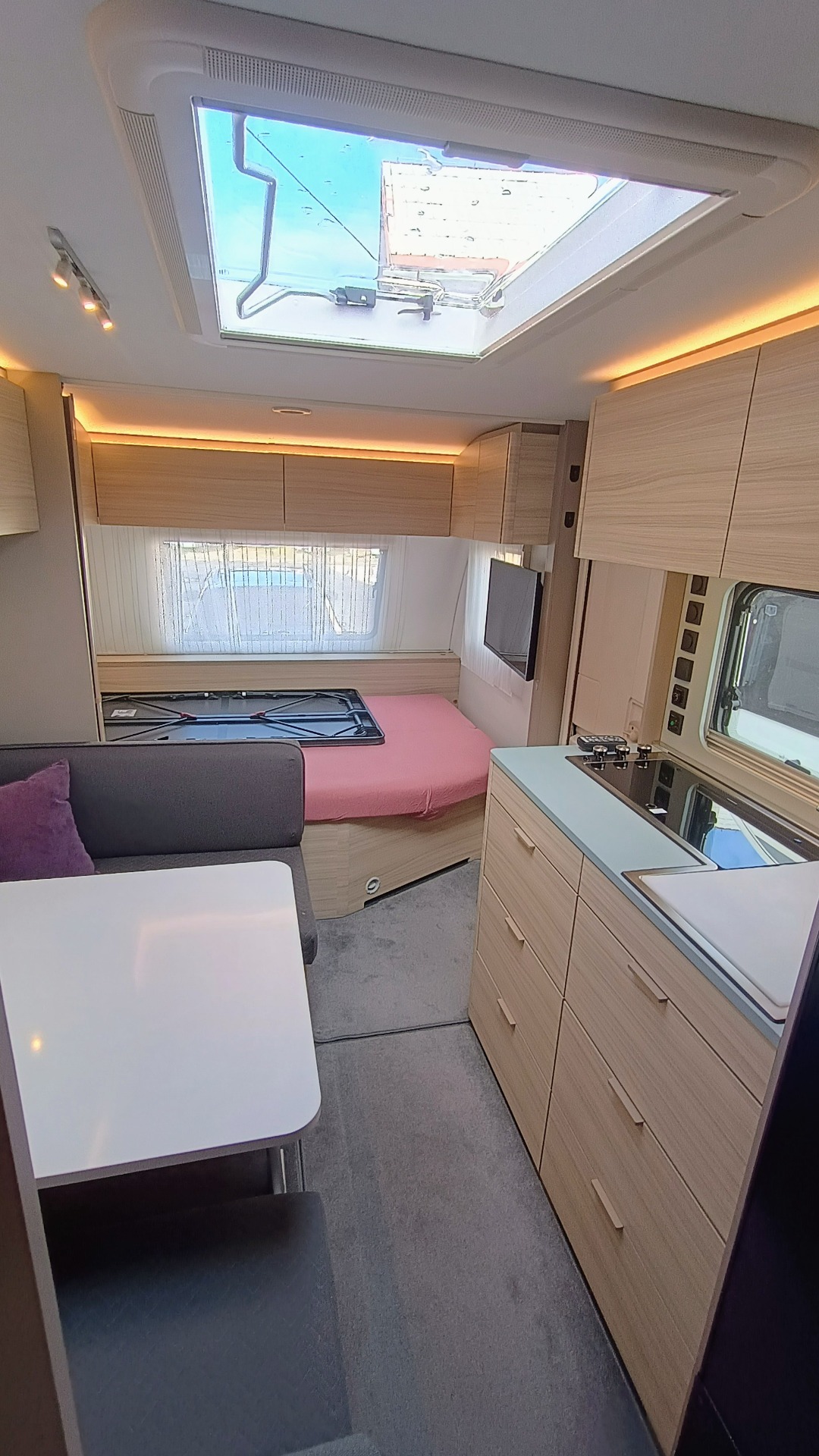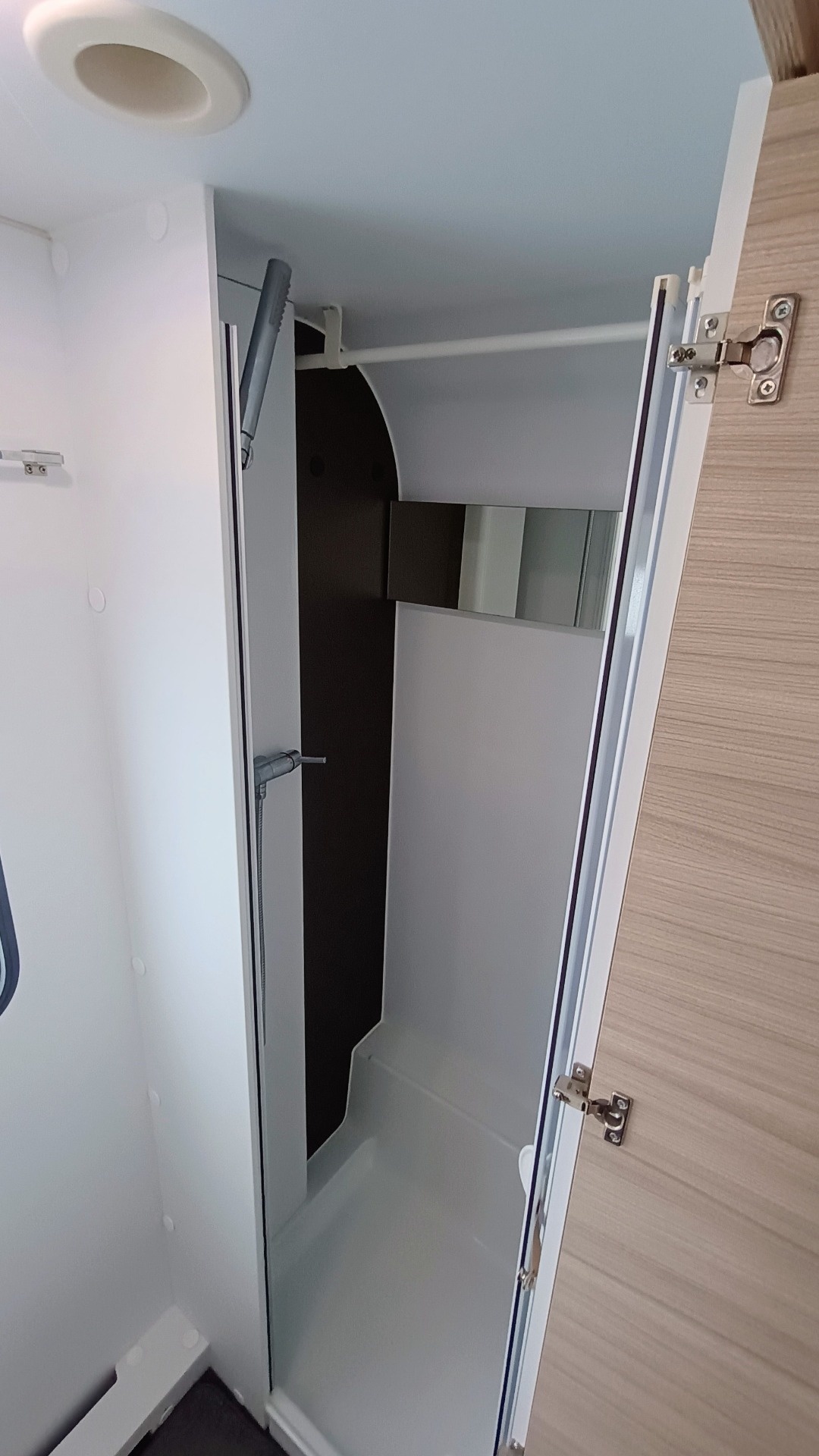 * Vpředu velké lůžko, uprostřed sezení, které můžete proměnit v další lůžko. Naproti kuchyňka, vedle velká lednice + oddělený mrazák, vzadu koupelna s chemickým WC, umyvadlem a ODDĚLENÝM sprchovým koutem!!! Naproti 3x palanda