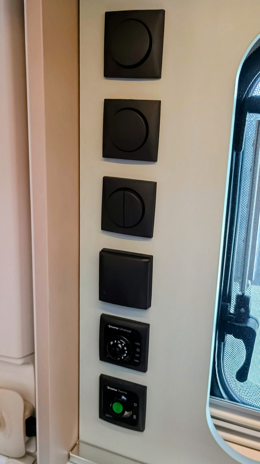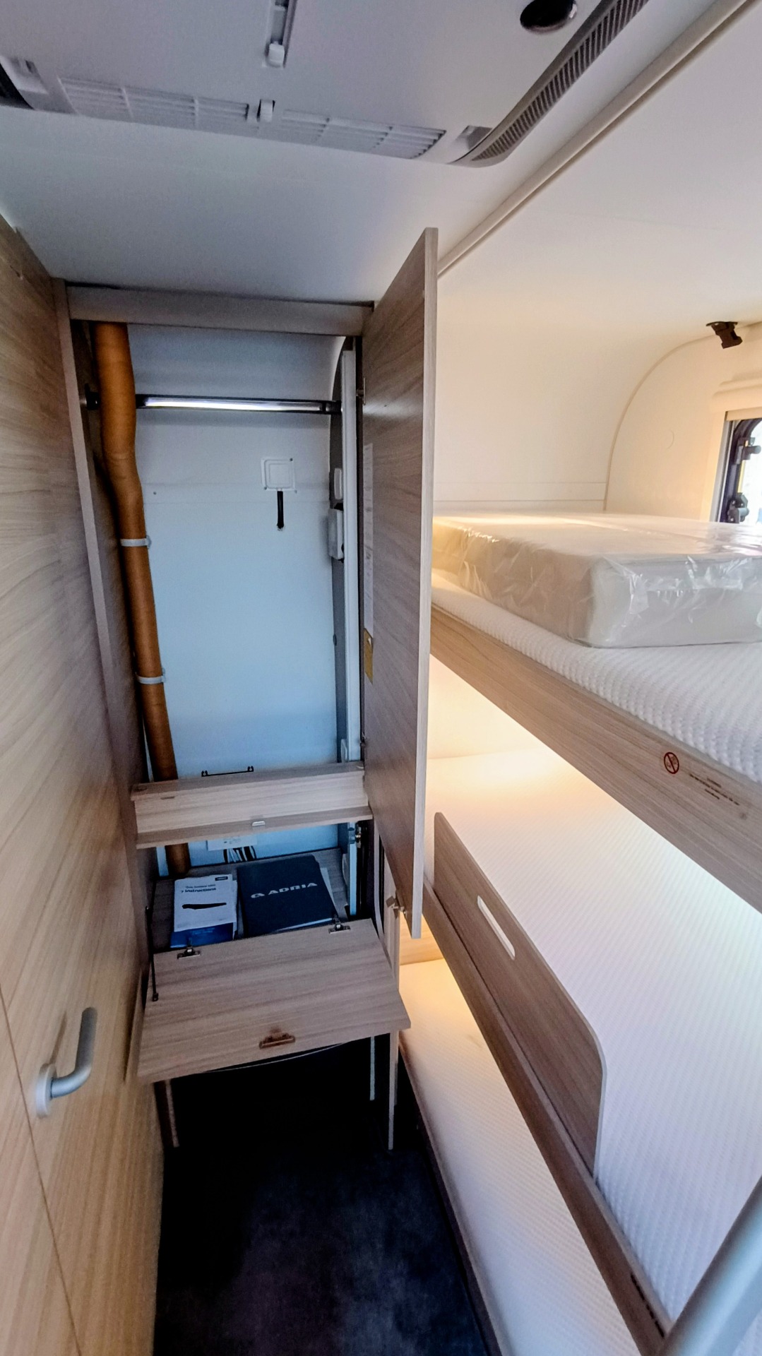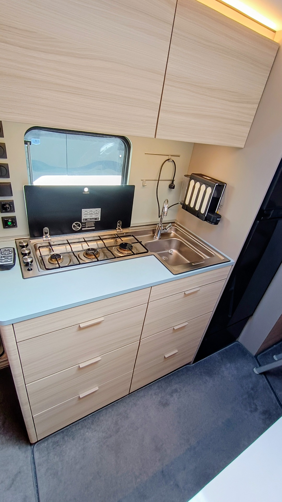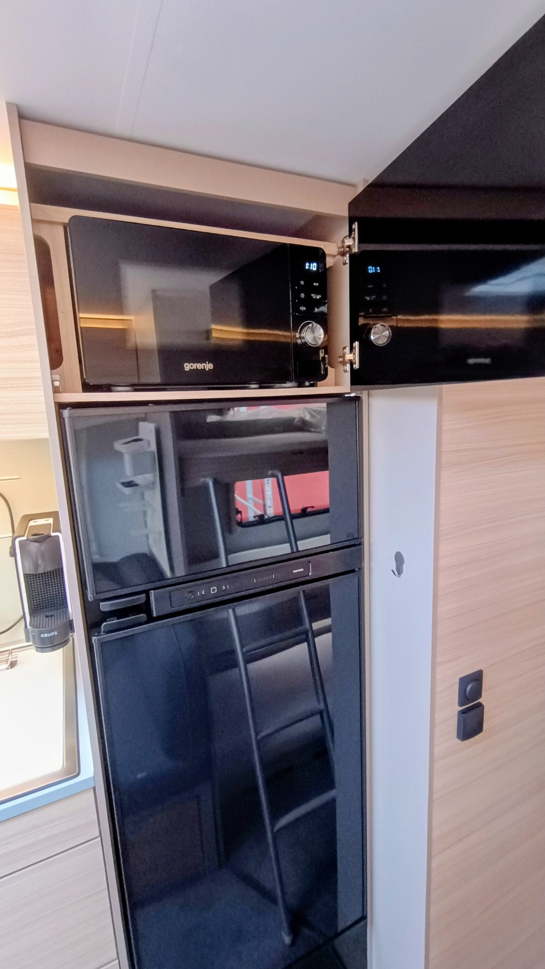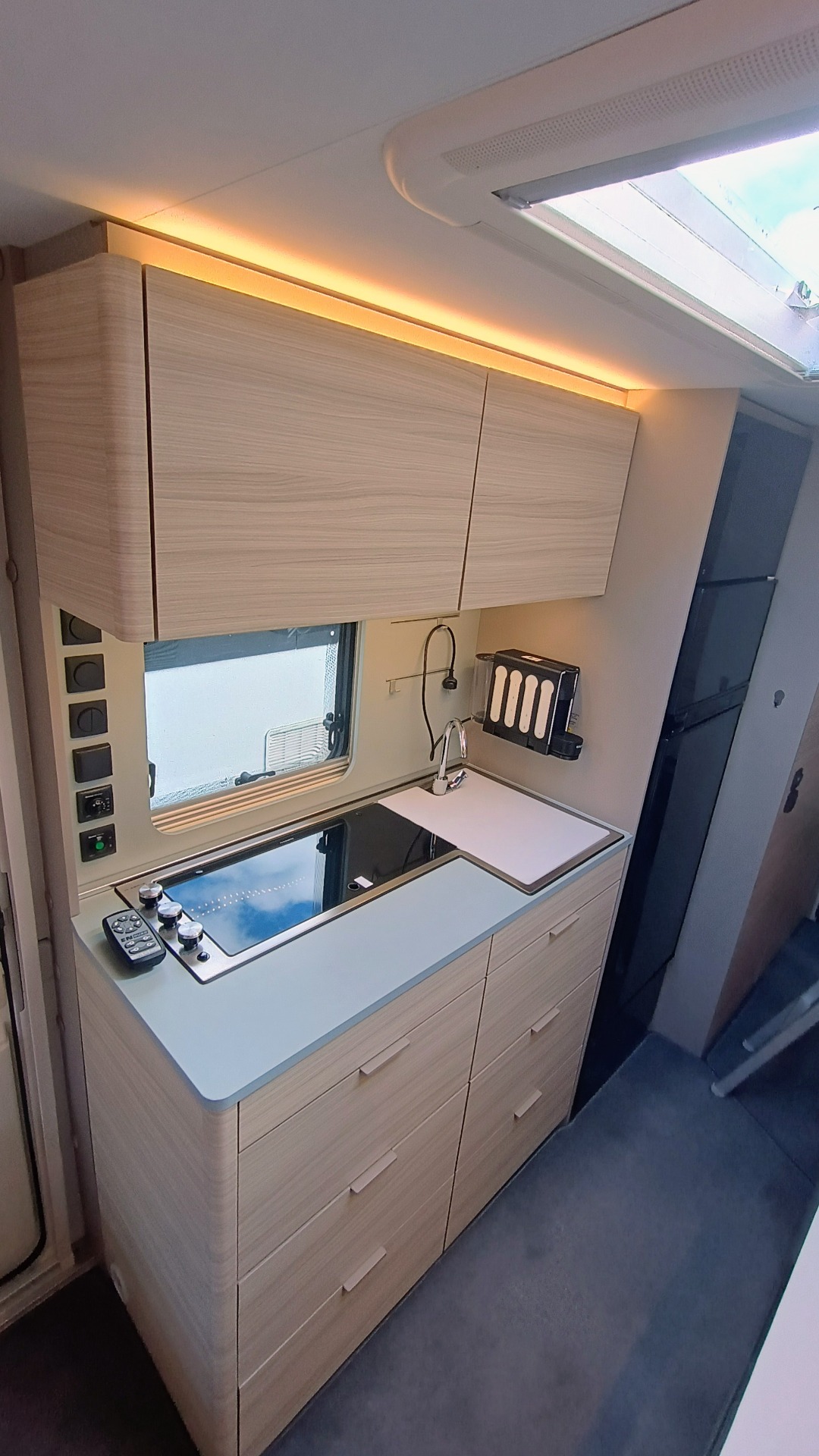 * Vpředu velké lůžko, uprostřed sezení, které můžete proměnit v další lůžko. Naproti kuchyňka, vedle velká lednice + oddělený mrazák, vzadu koupelna s chemickým WC, umyvadlem a ODDĚLENÝM sprchovým koutem!!! Naproti 3x palanda