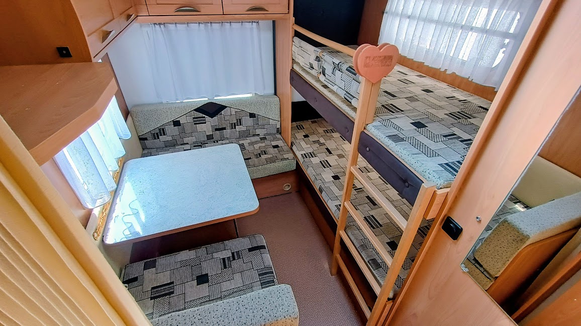 * Vpředu velké "U" sezení, které můžete složit na veliké lůžko, vzadu 2 palandy + 2. sezení, které můžete proměnit také v lůžko