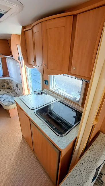 * Je vybaven vařičem se třemi plotýnkami, kuchyňským dřezem