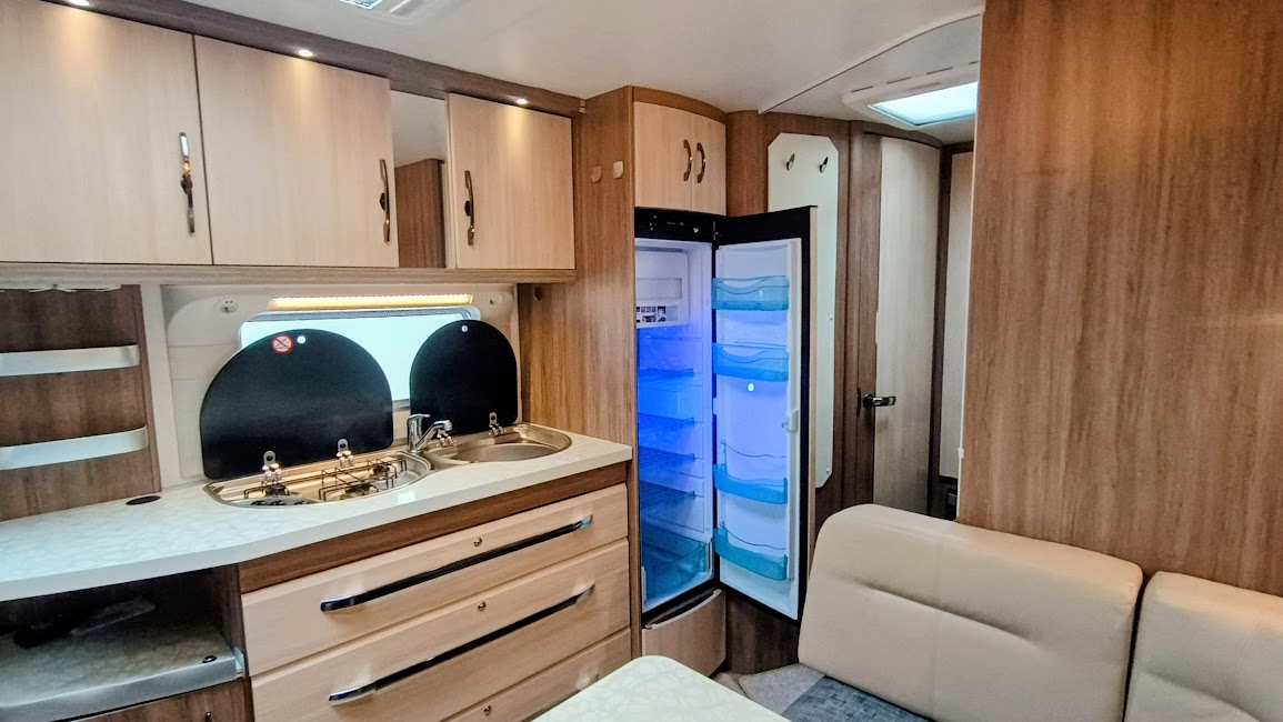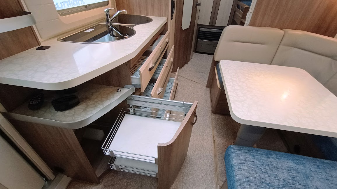 * Je vybaven vařičem se třemi plotýnkami, kuchyňským dřezem