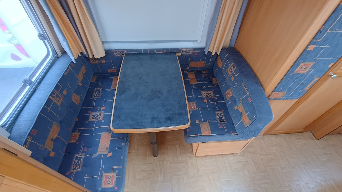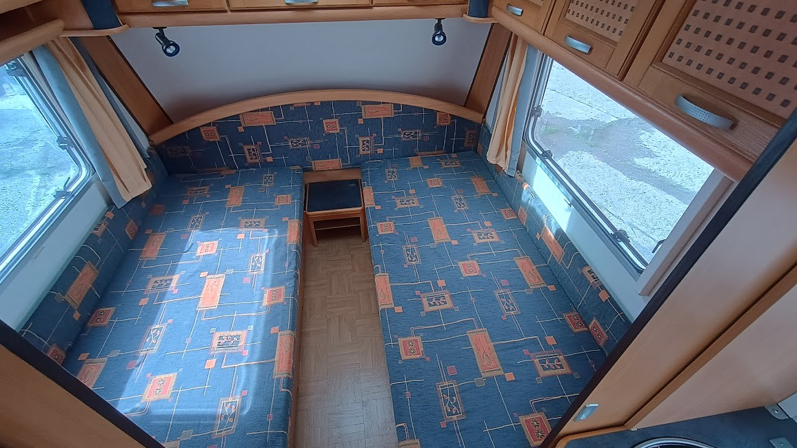 Dispozice: Vzadu rozkládací sezení, které je možno složit na spaní, vedle něj šatní a odkládací skříň + topení. Uprostřed kuchyňka s dřezem, vařičem se 3 plotýnkami, lednicí, odkládací skříňka + šuplík na příbory. Naproti koupelna s chemickým WC. Vpředu 2 x dělené lůžko, které je možno složit na letišťe. 4x střešní okno - vzadu, uprostřed, v koupelně, v ložnici.