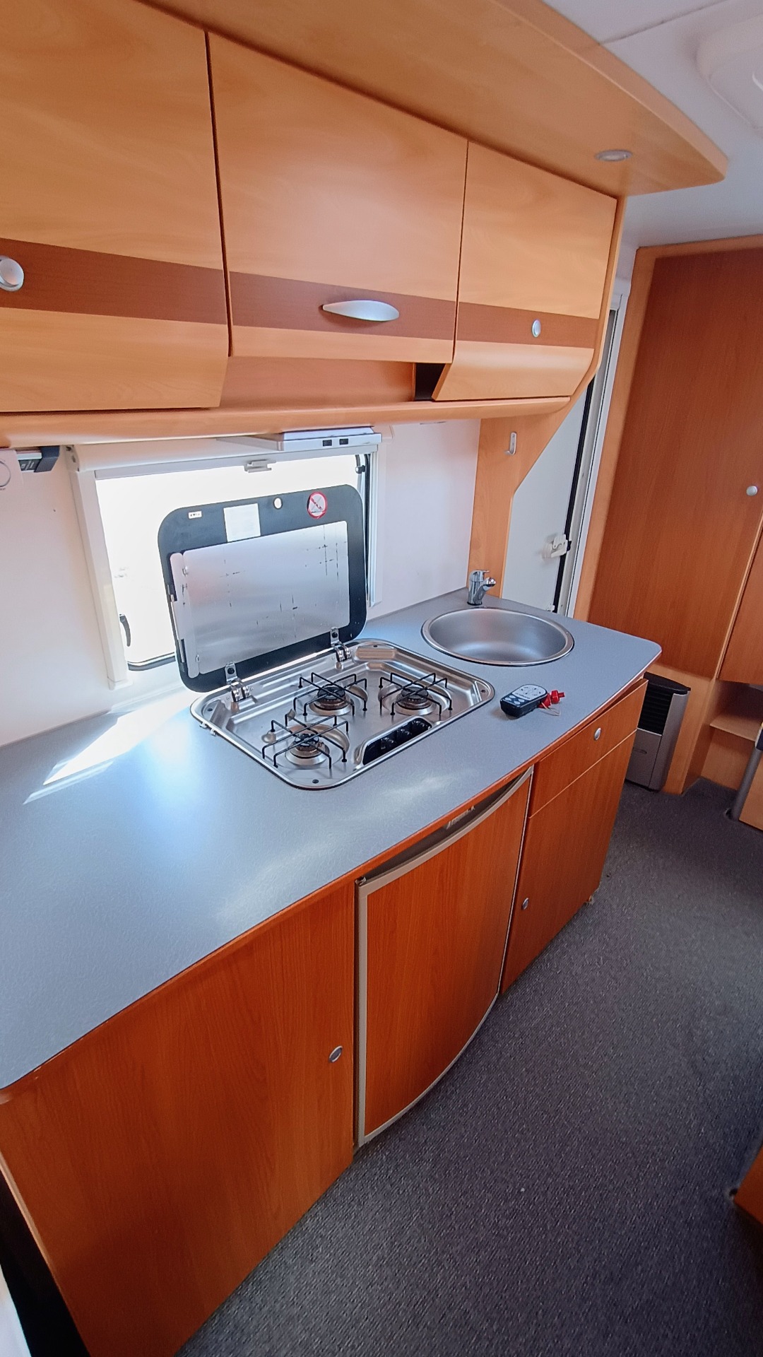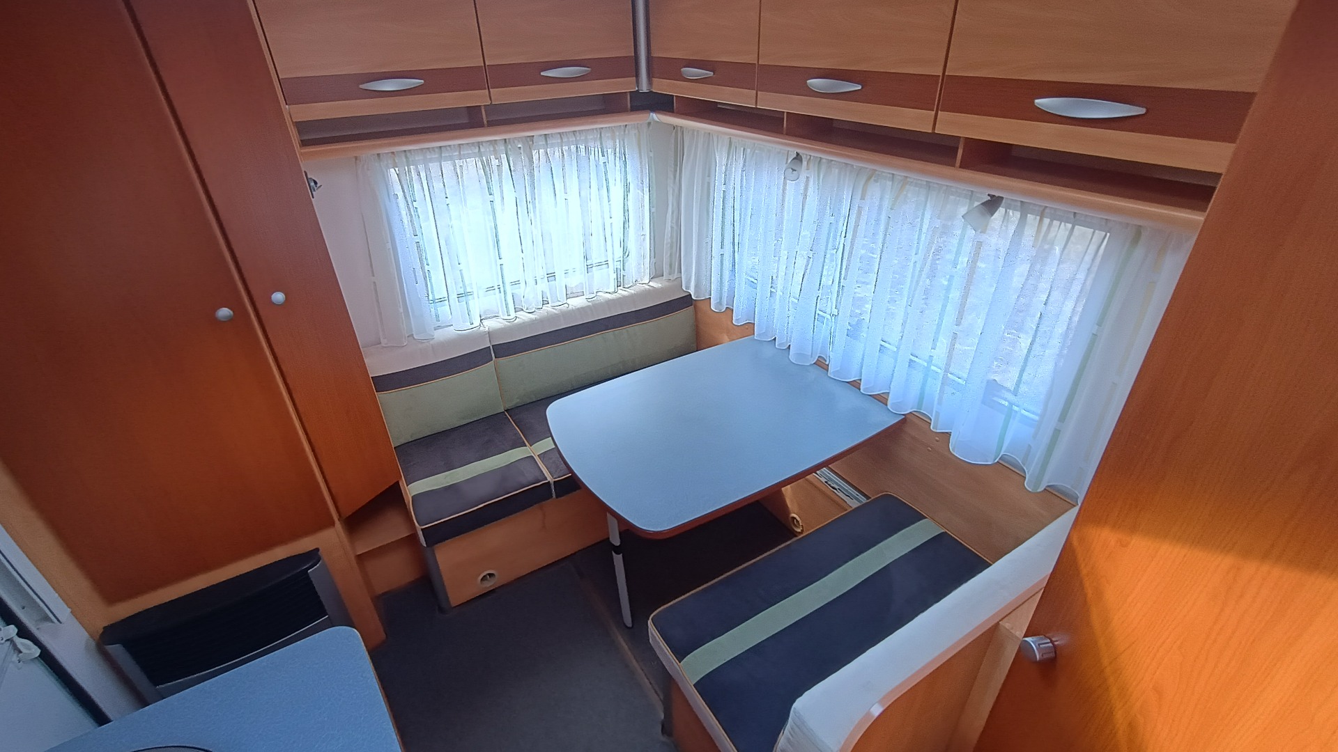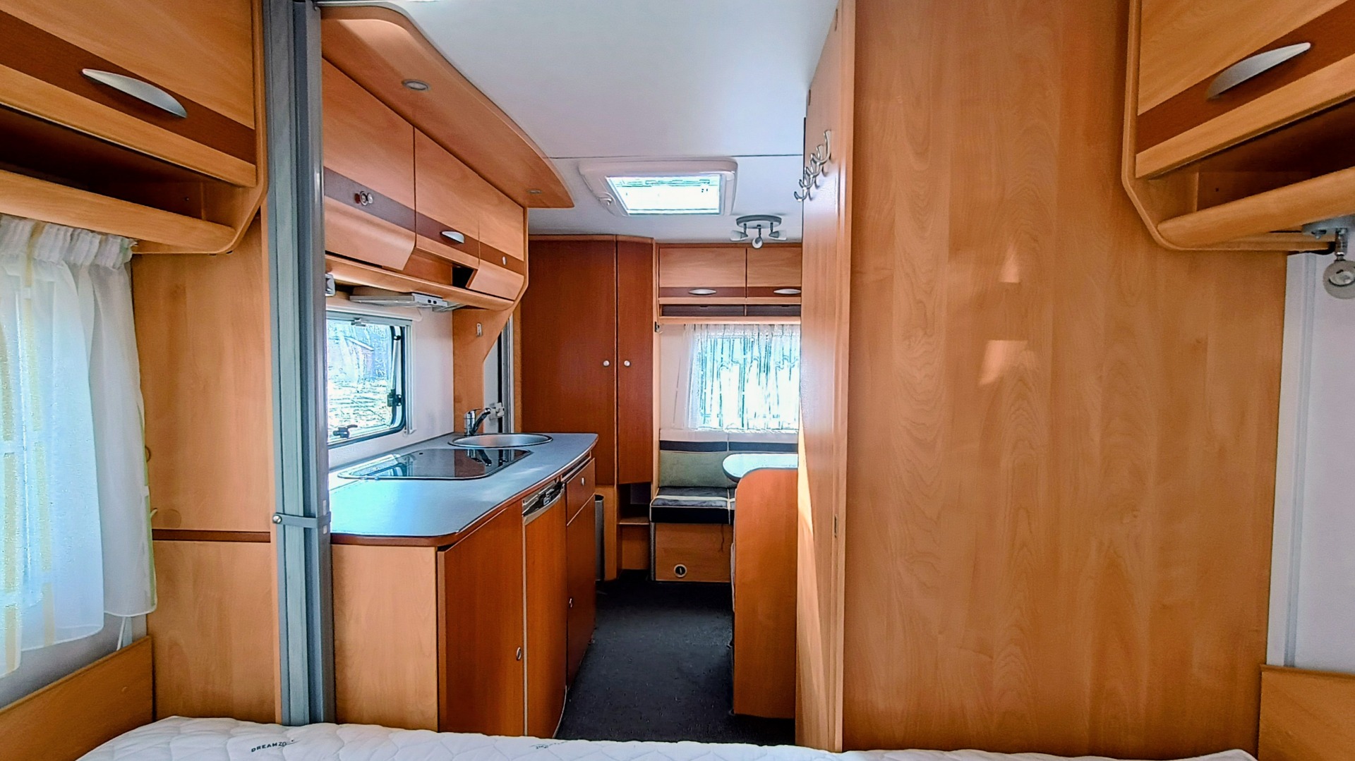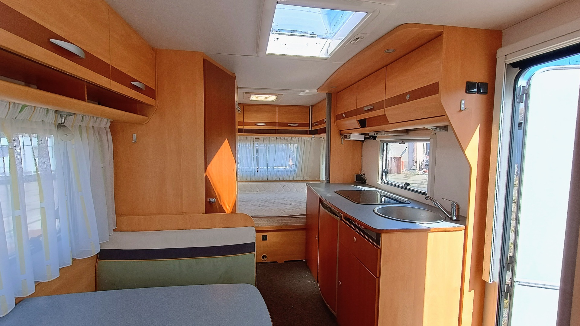 * nádrž na vodu (50l), lednice Dometic v trojkombinaci (plyn, 12V, 230V), 2x střešní okno, topení s rozfukem teplého vzduchu na 230V, vchodové dveře samozřejmě dělené, všechna okna jsou vybavena termožaluzií a moskytierou.